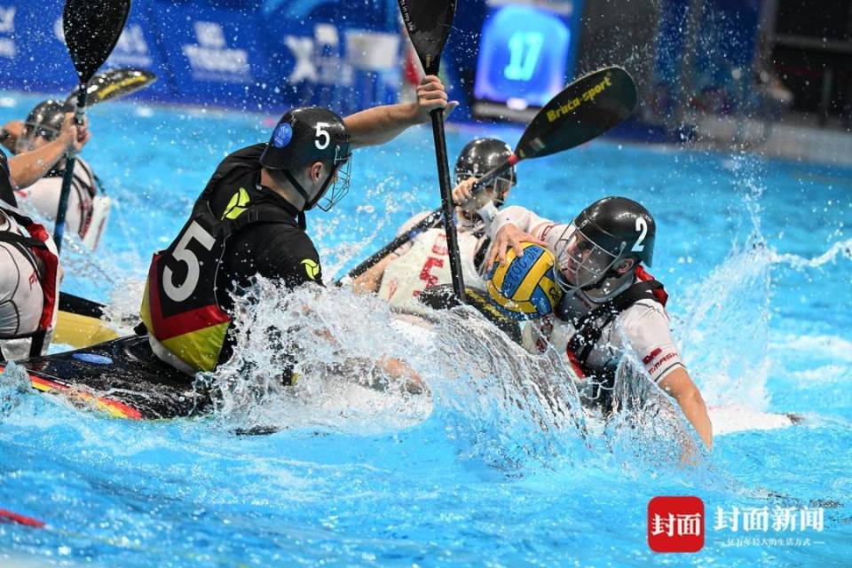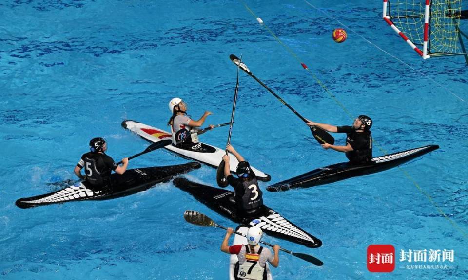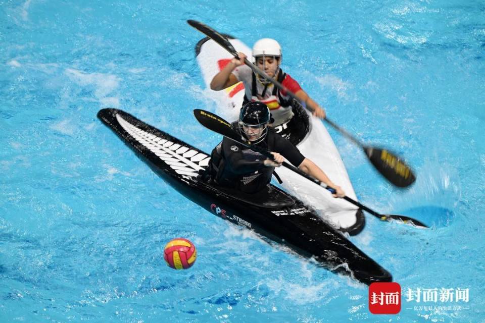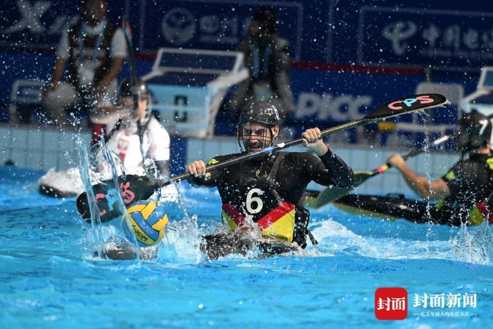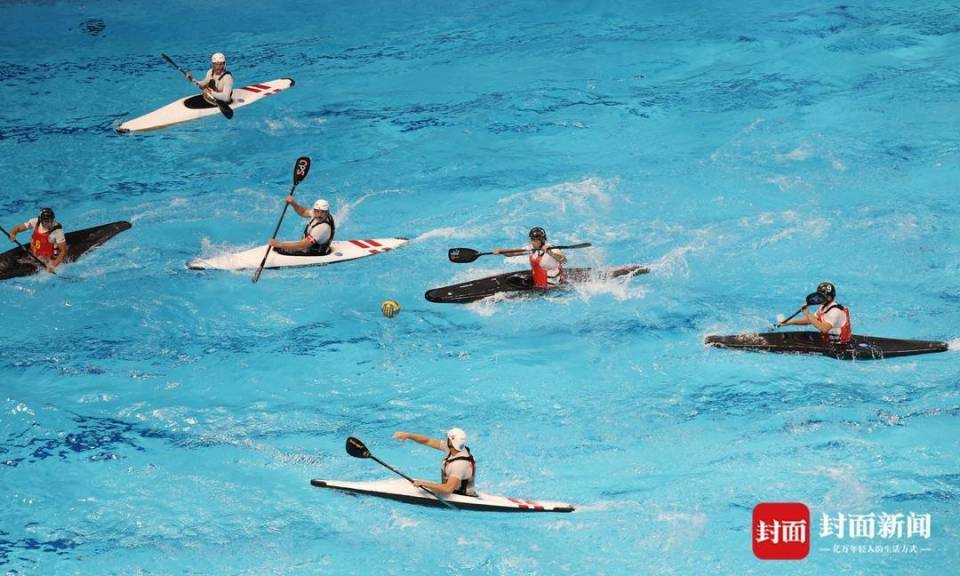 这项起源于英格兰的运动,在35米×23米的矩形泳池内上演着速度与激情的碰撞,运动员驾驭皮艇疾驰、急转、急停,用手或桨争夺控球权,向悬于水面的长方形球门发起冲击。