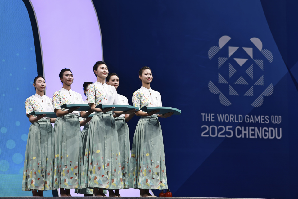 ballbet 8月8日,志愿者在成都世运会技巧女子双人项目颁奖仪式上。新华社记者 孙凡越 摄